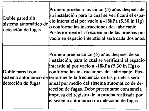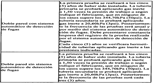 8.1 La periodicidad de las pruebas de hermeticidad a tanques y tuberías descritos en las Tablas No. 5 y 6 aplican tanto a instalaciones nuevas como a las que se encuentran en servicio.