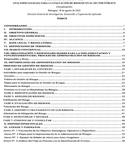 En la administración moderna, en materia de riesgos se han emitido una serie de modelos, marcos, herramientas, técnicas que podrían ser utilizados por las Entidades y Organismos, sin embargo la Contraloría General de la República de Nicaragua, con la finalidad de unificar criterios, ha considerado necesario desarrollar una metodología que se adecúe a las características organizacionales propias del sector gubernamental, como un esfuerzo inicial que permita establecer las bases de una implementación progresiva de modelos integrales en la gestión de riesgos.
