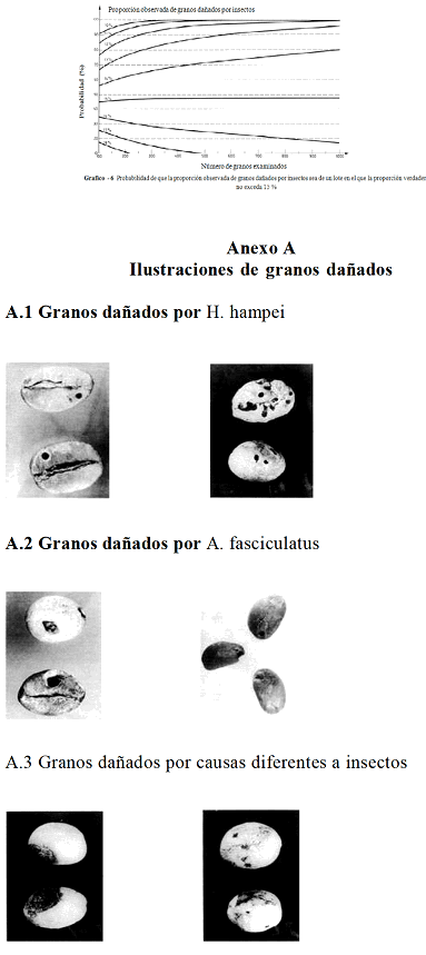 La probabilidad de que la proporción verdadera de granos dañados por insectos en un lote no exceda un valor dado se obtiene de la proporción observada de granos dañados por insectos en la porción de ensayo (véase la cláusula 9 y los Gráficos del 2 al 6).