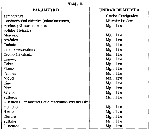 1.4 Realizar un monitoreo anual de la descarga, de acuerdo a los parámetros y unidades de medida estipulados en la Tabla B del Artículo 7 del presente Decreto, con el propósito de contar con un control de la presencia de otros parámetros que pueden afectar las condiciones ambientales y sanitarias del cuerpo de agua.