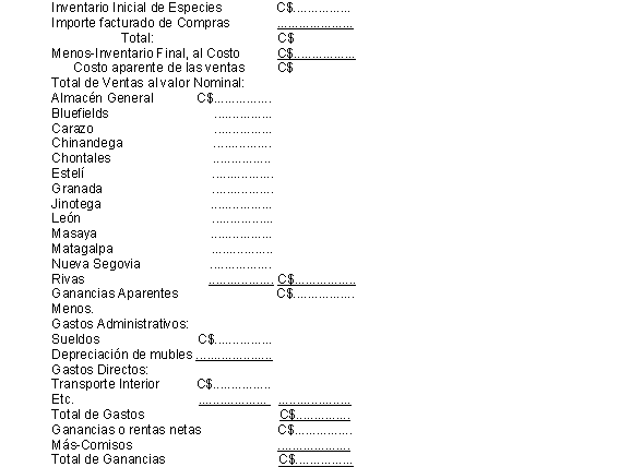 Artículo 39.- Los resultados comerciales líquidos del Negociado del Estanco de Fósforos, Cerillas y Encendedores, se demostrarán en un Estado de Ganancias y Pérdidas, que contengan la liquidación por especies en una forma más o menos como esta: