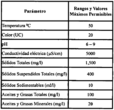Artículo 22. Rangos y Valores Máximos Permisibles para los Vertidos a la Red de Alcantarillado Sanitario. Los vertidos de aguas residuales de origen domésticos, industriales, comerciales, agroindustriales y de servicio autorizados, de acuerdo a sus características, que sean descargados al alcantarillado sanitario, deberán cumplir los rangos y valores máximos permisibles siguientes: